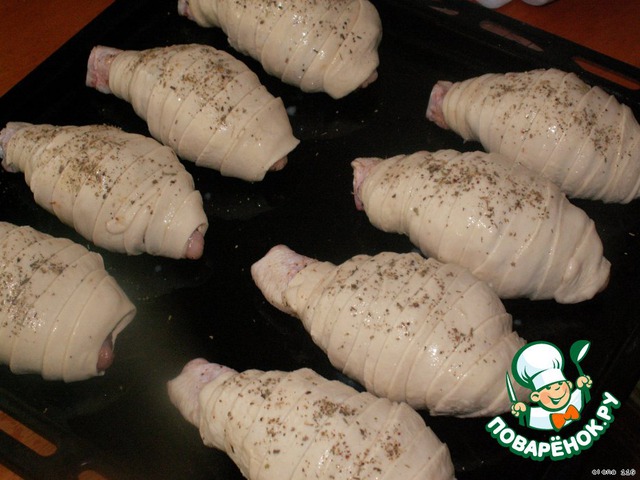 Обмотать каждую голень полосками теста, начиная с косточки.