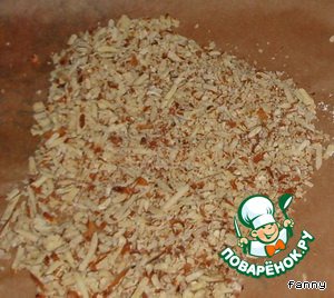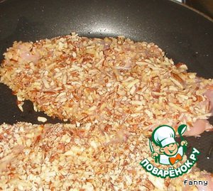 На другой лист насыпать тонким слоем рубленый миндаль. Каждую куриную грудку обвалять в муке, обмакнуть во взбитое яйцо, обвалять в миндале, слегка прижимая кусочки орехов рукой, чтобы они не осыпались.