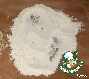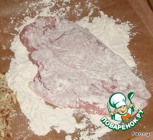 Куриные грудки слегка отбить, придать им ровную форму. Приправить солью и перцем. Взбить яйцо. Муку высыпать на лист пергамента.