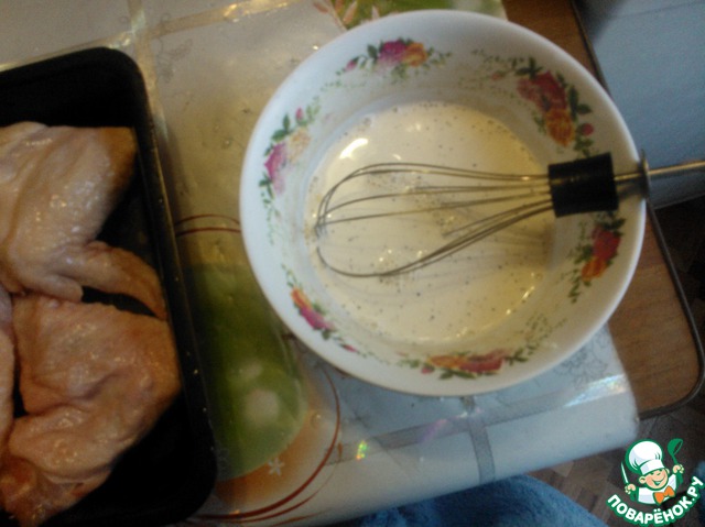 Делаем маринад:смешиваем сливки, чеснок, горчицу, мед, соль, паприку и душистый перец. хорошо взбиваем. выливаем в протвинь в уже подготовлинные крылышки.