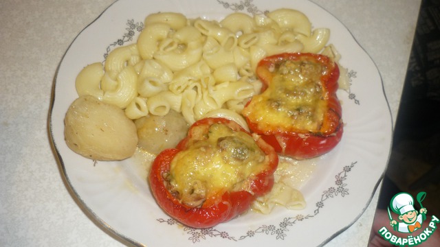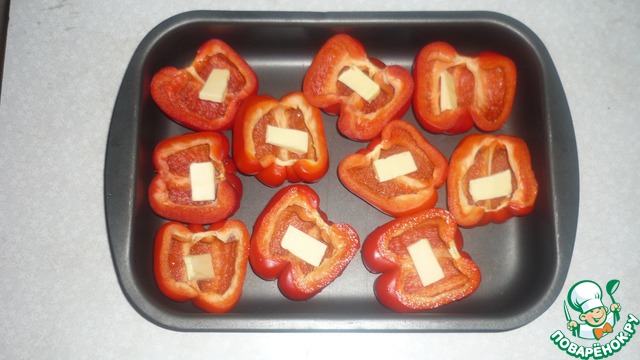 Пока мясо маринуется, режем перец пополам, желательно так, чтобы разрезанные половинки стояли ровно и не было дырок. Вычищаем. Выкладываем в глубокую посуду, пригодную для духовки. В каждый перчик кладем кусочек сливочного масла (5-10 гр.)