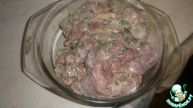Нарезаем мясо небольшими кусочками. Маринуем в приправах (кто какие любит) + соль 3-4 часа. Не лишним будет посыпать, если есть, рубленой свежей зеленью. Если нет времени, можно добавить чуть майонеза, тогда мариновать минут 30.