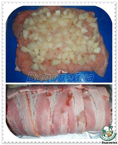 Сверху на бекон выкладываем приготовленное филе (должно получиться что-то вроде прямоугольника или квадрата).