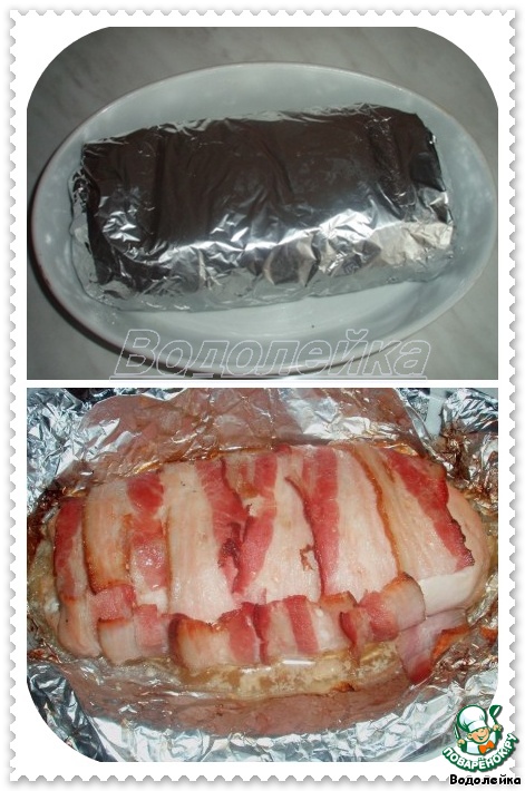 Заворачиваем рулет в пищевую фольгу и отправляем в духовку t 180* минут на 30. После пищевую фольгу сверху открыть и отправить в духовку еще минут на 20, чтобы бекон немного подрумянился. Хотя в каждой духовке время будет отличаться.