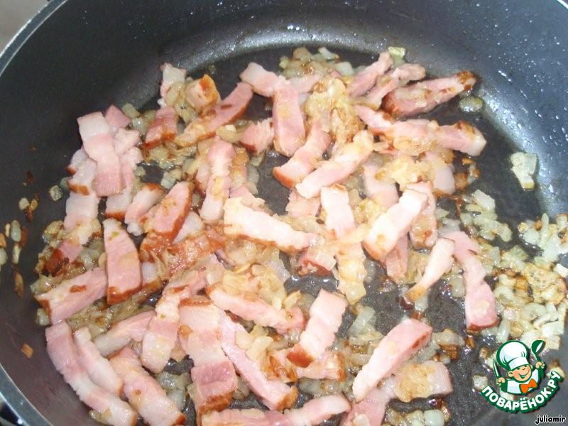 Бекон нарезать небольшими кусочками, добавить в сковороду и готовить, помешивая, 5 мин. Шумовкой переложить овощи и бекон в миску, отставить.