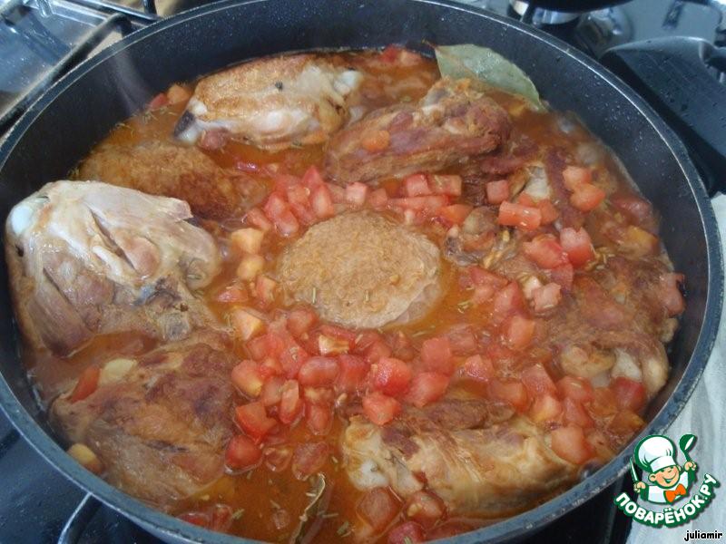 5. Добавить томаты (я брала 4 свежих помидора, снимала с них кожицу и резала кубиками), сахар, листики розмарина ( брала сухой) и лавровый лист. Влить 100 мл холодной воды, перемешать и довести до кипения.