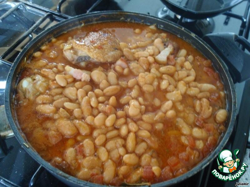 6. Вернуть в сковороду овощи и бекон. Добавить консервированную фасоль в томатном соусе, перемешать. Готовить под крышкой 10 мин.