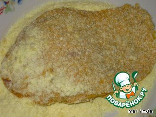 Затем филе запанировать в картофельных хлопьях с двух сторон, слегка прижимая панировку.