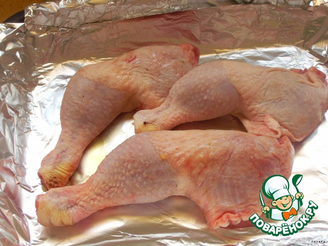 Окорочка натереть тремя дольками апельсина, натереть чесноком и обвалять в соусе (соль-перец-приправа -оливковое масло).