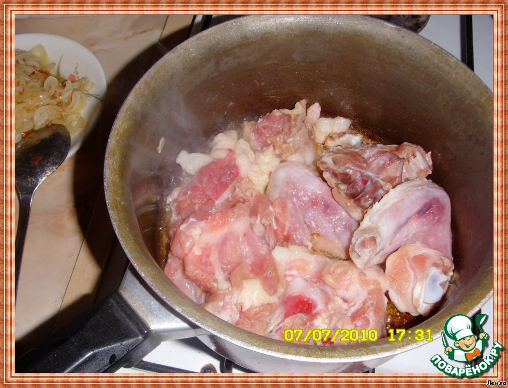 В кастрюле, в которой жарился лук, обжариваем куски курицы до золотистого цвета.