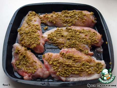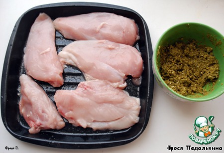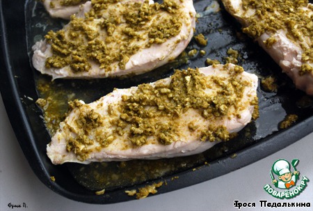 Смазать филе сверху соусом песто. Поставить в разогретую до 180 гр. духовку и запекать 10 минут.