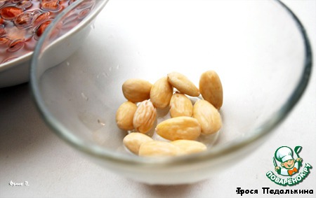 Миндаль залить кипятком на 2 минуты. Воду слить, залить кипятком еще раз и оставить на 10 минут, затем очистить от шкурки.