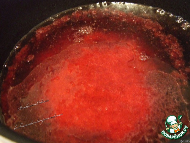 -Отдельно в сотейнике выпариваем вино до половины, добавляем брусничное пюре, бальзамико, выключаем.