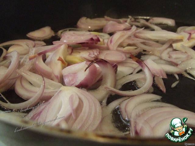 -Разогреваем в сковороде масло и на небольшом огне обжариваем лук до мягкости.