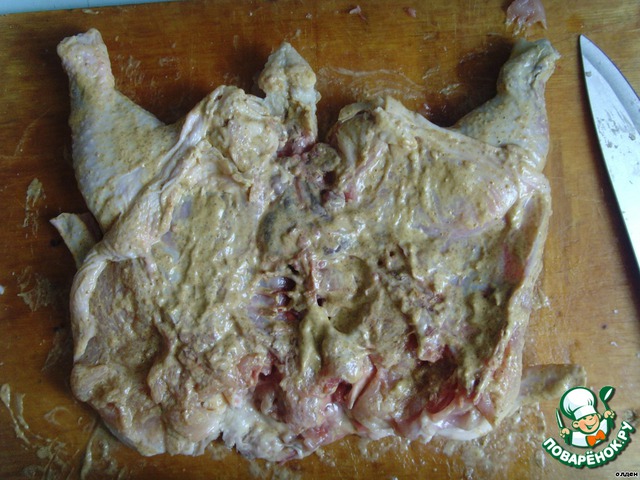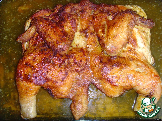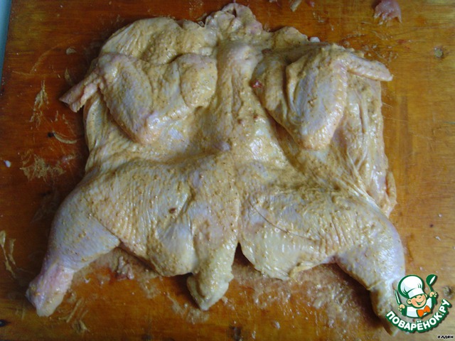 Берем тушку курицы, лучше небольшую, чтоб прожарилась. Разделываем вдоль груди, слегка отбиваем, натираем солью, аджикой (а в идеале ее натирают сметаной с небольшим добавлением чеснока). Жарим на раскаленном масле, на умеренном огне, по 15 - 20 мин. с обеих сторон, под прессом. Если курица не прожарилась можно переложить ее на противень и довести до готовности в духовке с небольшим добавлением воды.