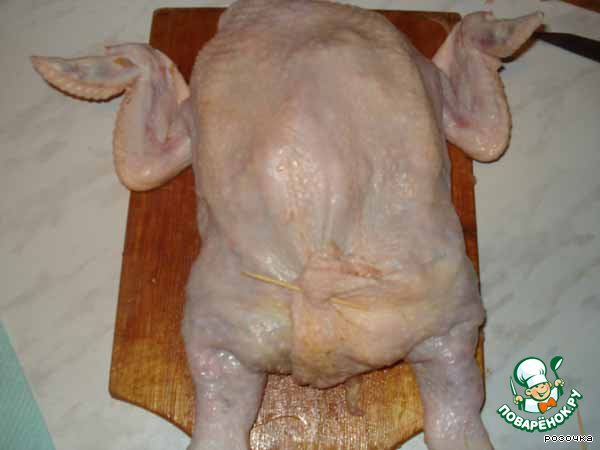 Фарш засунуть в кожу и сформировать тушку курочки.