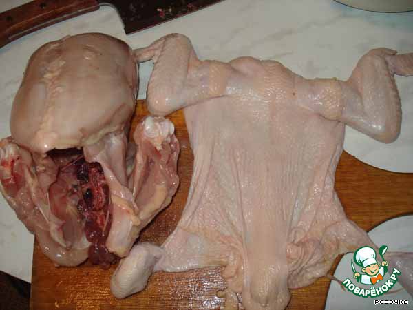 Пока рис варится, с курицы снять кожу, оставив крылышки.