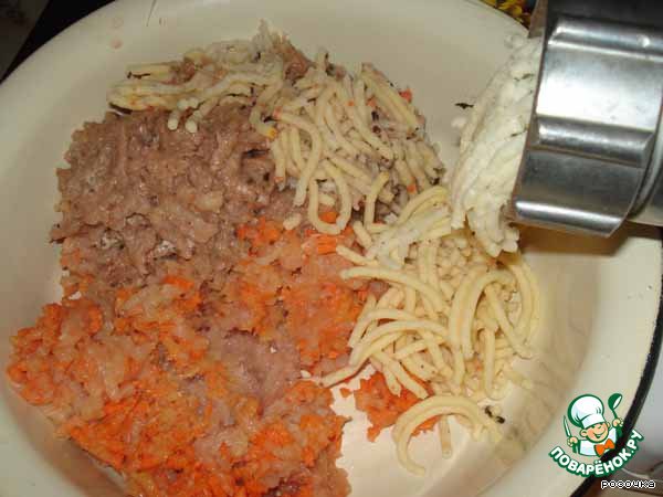 Пропустить через мясорубку куриное мясо, лук, чеснок, рис, сыр, чернослив, морковь.