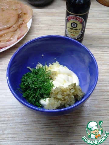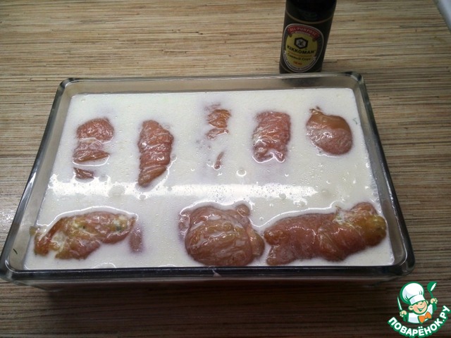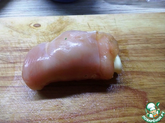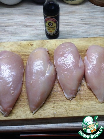 У меня были грудки с костью и кожей. Поэтому разделываем на филе, получается 4 куска филе. Дальше каждый кусок филе перерезаем вдоль на 2 пласта. Итого у нас получается 8 пластов.