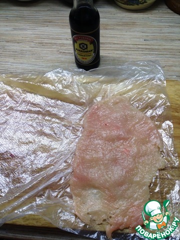 Каждый пласт хорошенько отобьем ручкой ножа или плоской частью молотка для мяса. Делать это лучше через пакет, чтобы не растрепать пласт филе.
