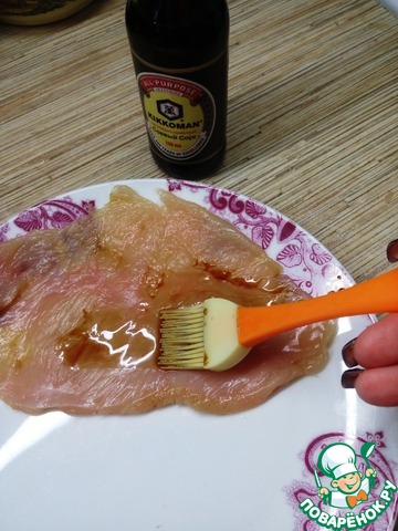 Каждую отбивнушечку хорошо смазываем соевым соусом с обеих сторон и оставляем мариноваться минимум на пол часа.