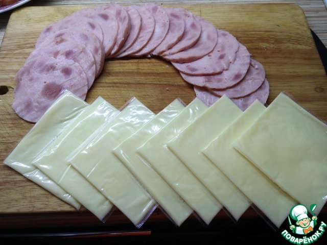 Подготовим начинку для рулетиков. Ветчину и сыр нарезаем тонкими слайсами. У меня сыр был плавленный ломтиками.