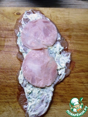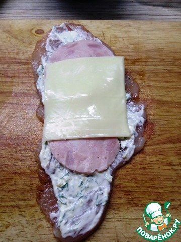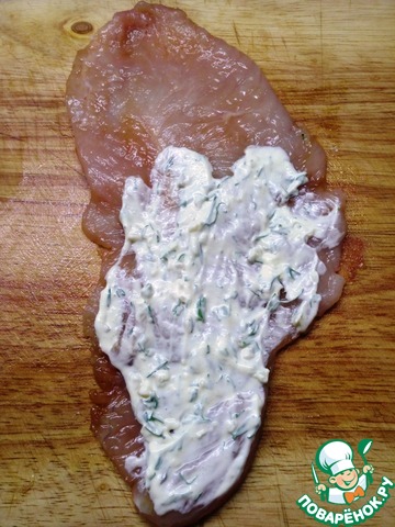 Формируем рулетики. Отбивную смазываем соусом "Тар-тар"