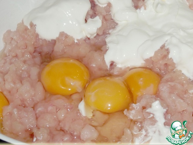 Приготовить фарш из куриной грудки. В него добавить яйца куриные, сметану, соль, специи, муку и тщательно перемешать.