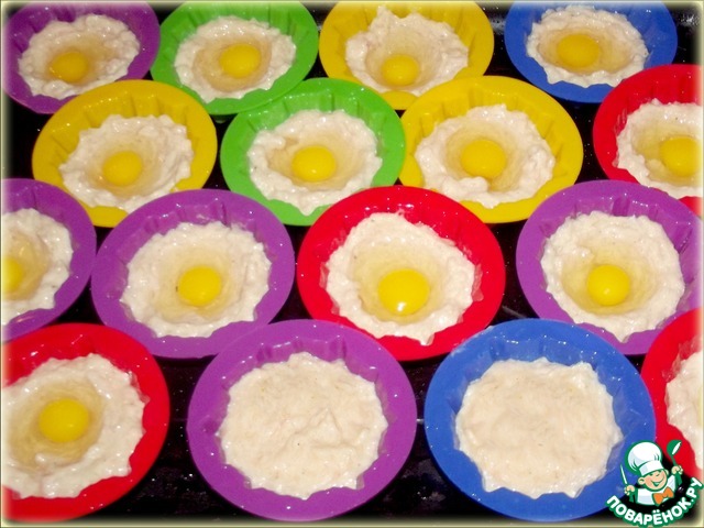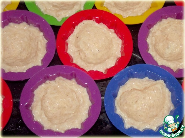В силиконовые формы для кексов выкладываем по 1 полной столовой ложке фарша и делаем в центре углубление (ложкой по кругу как бы поднимаем фарш на стенки формы) должно уйти 2/3 фарша.