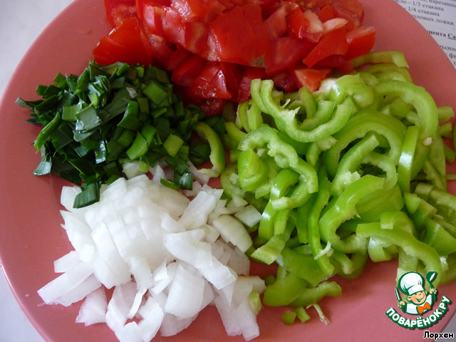 Нарезать лук репчатый, перец, лук зеленый и помидор.