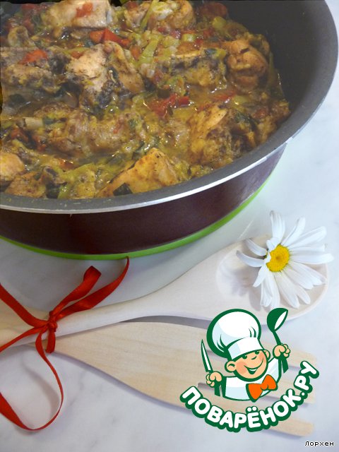Куриные окорочка разрезать на порционные кусочки, натереть солью и перцем. Обжарить на сковородке на растительном масле. Приправить карри.