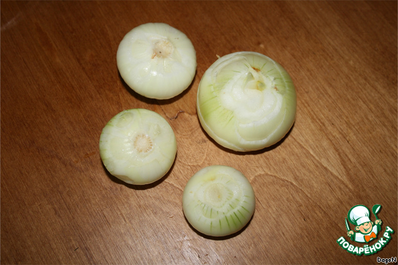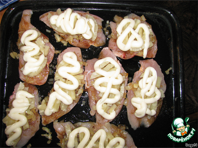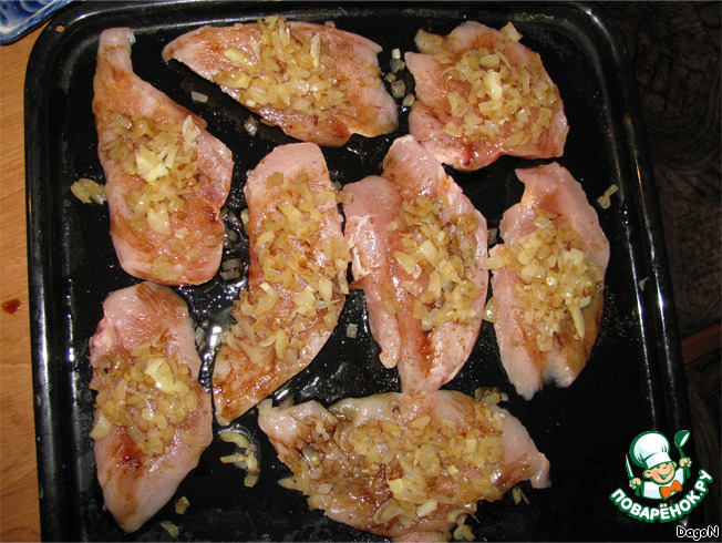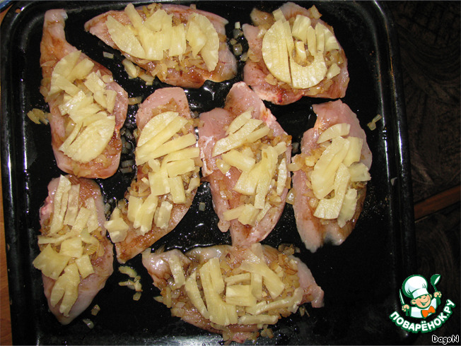 На лук выкладываем нарезанный соломкой ананас (из расчета 1 колечко на 1 кусочек курицы)