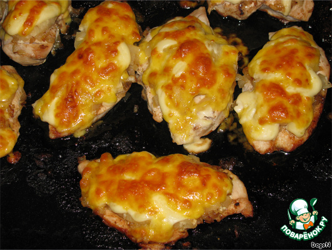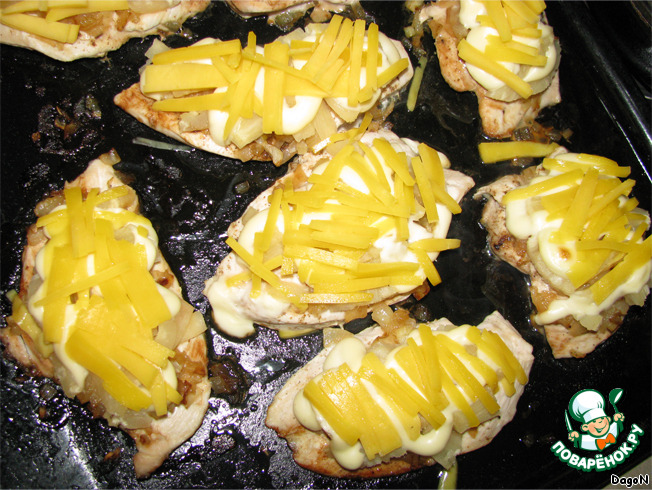 Сыр натереть на крупной терке или нарезать мелко соломкой, выложить сверху на курицу. Опять отправить в духовку, примерно на 15 минут.
