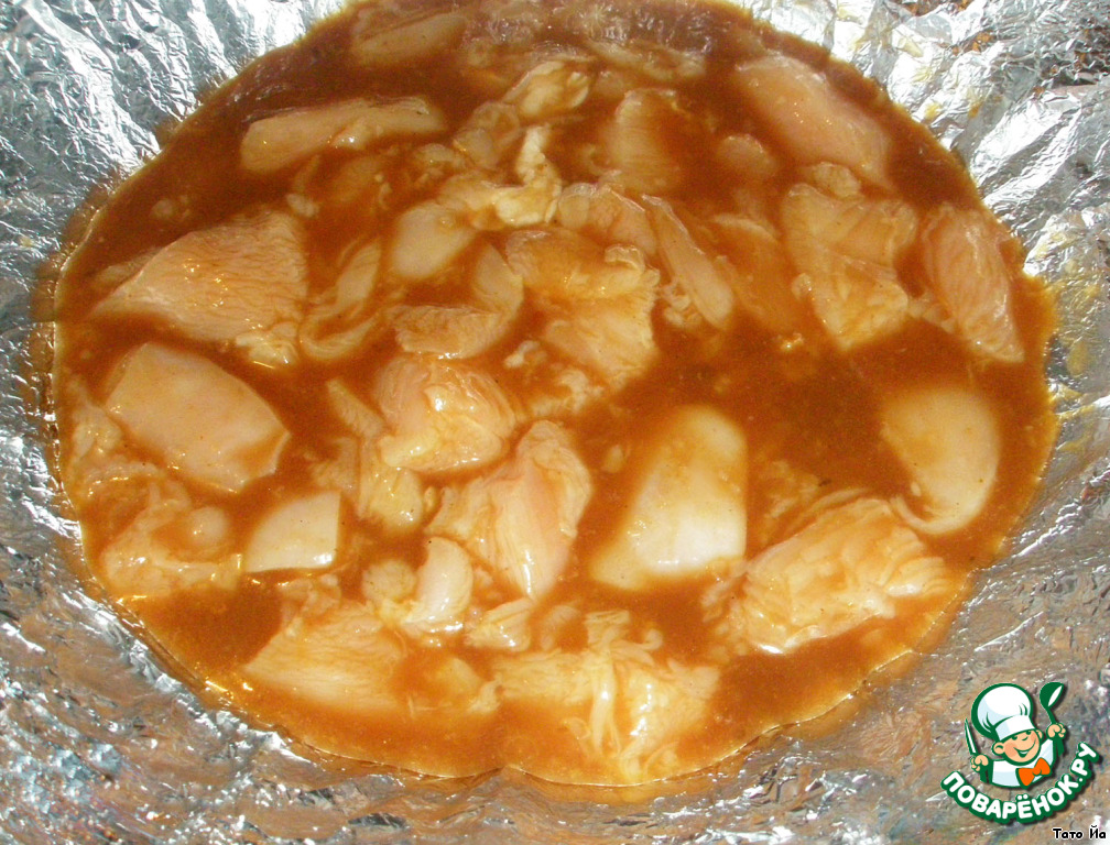 Перекладываем замаринованную курочку вместе с маринадом в форму для выпекания.