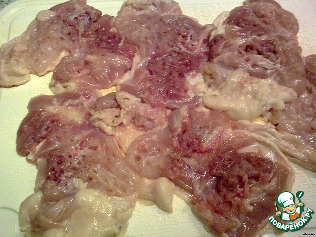 Куриные бедрышки надрезать, вынуть косточки и развернуть, чтобы получили стейки. Отбить