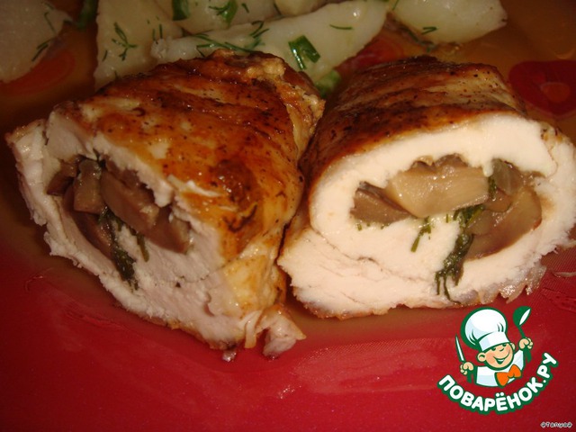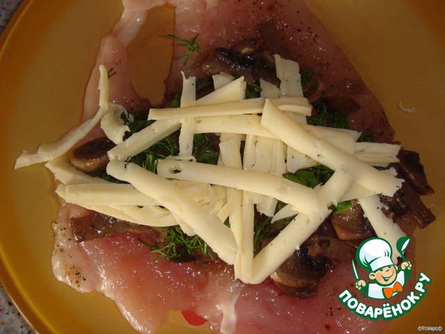 Каждый рулетик перетянуть ниткой и обжарить до готовности. Потом снять нитки (они снимаются легко).