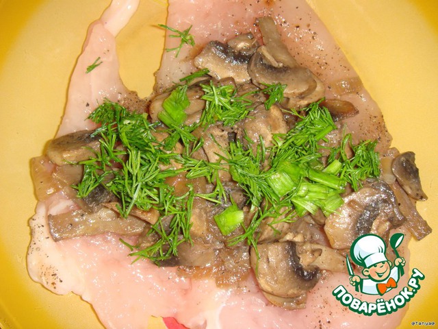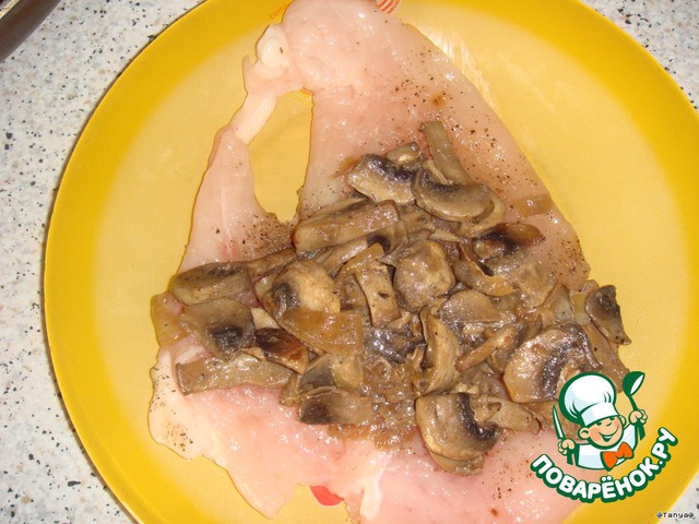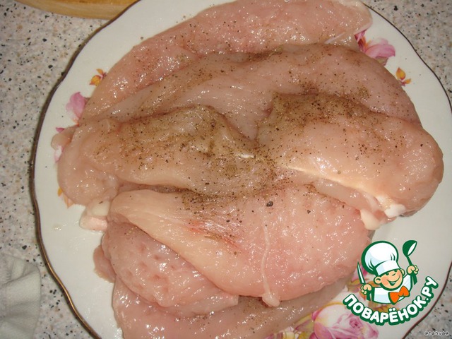 Каждую грудку разрезать на две части и отбить. Посолить и поперчить.