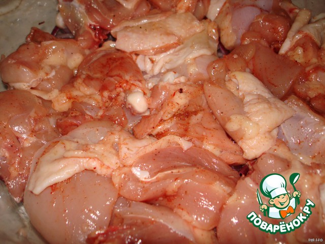 Бёдрышки промыть, нарезать небольшими кусочками (я резала на 4 части), натереть солью и паприкой.