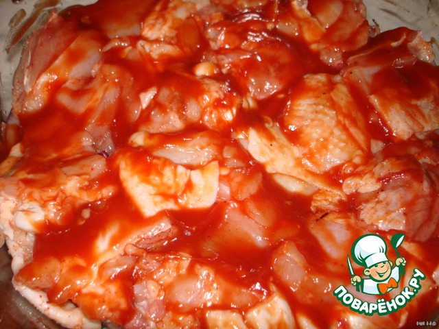 Смазать курочку кетчупом.