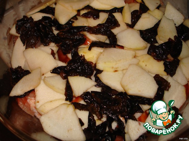 Курочка, запеченная с яблоками и черносливом