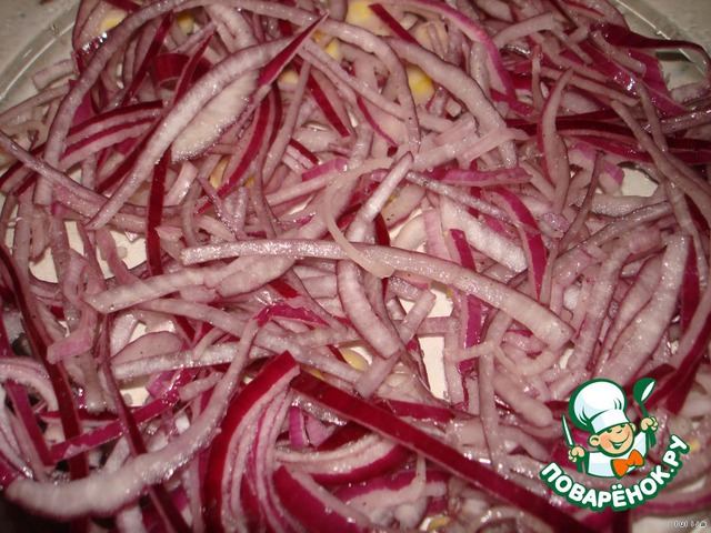 Луковицу помыть, очистить, нарезать полукольцами, посыпать черным перцем, cбрызнуть яблочным уксусом и помять рукой.