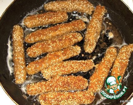 Жарим на несильном огне с обеих сторон. Готовятся такие пальчики быстро, так, что не стоит их сильно зажаривать.