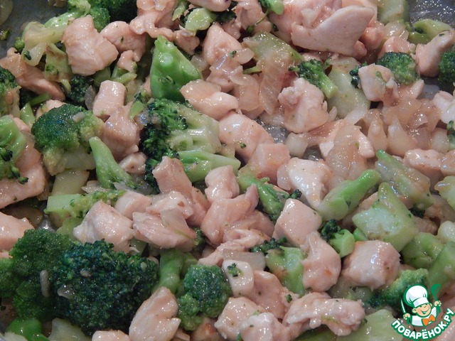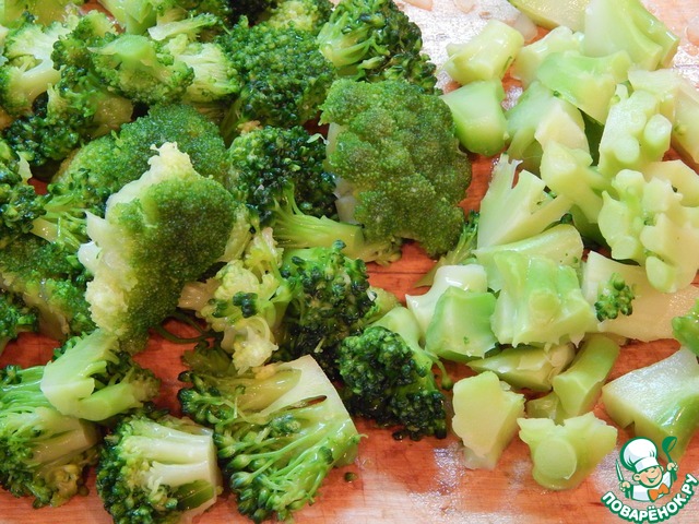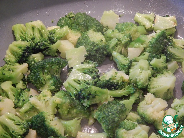В сковороде разогреваем масло и обжариваем на нем сначала стебли капусты 1 минуту, затем добавляем соцветия брокколи, и еще 2 минуты. Выкладываем обжаренную капусту в другую посуду.