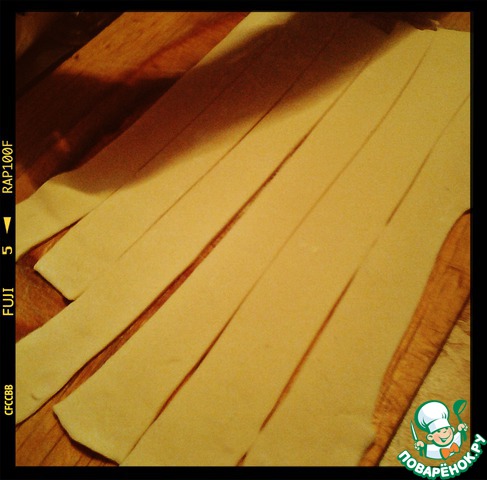 Слоеное тесто слегка раскатайте и порежьте вдоль.