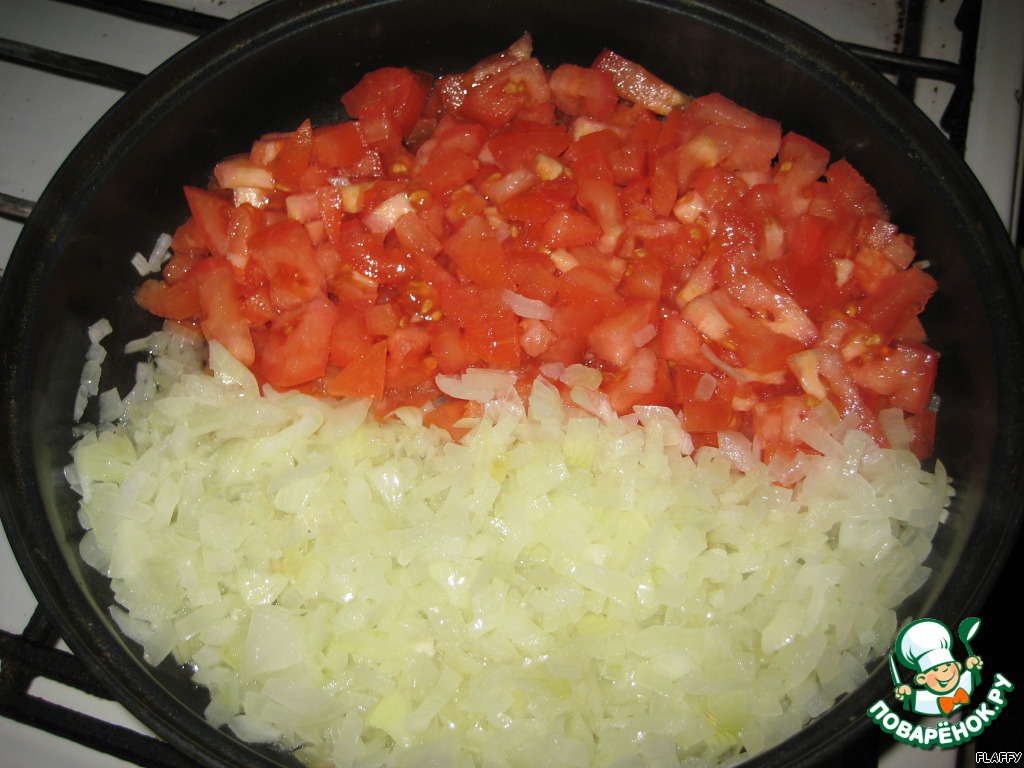Помидоры нарезать кубиками, добавить к луку. Тушить минут 5-10.