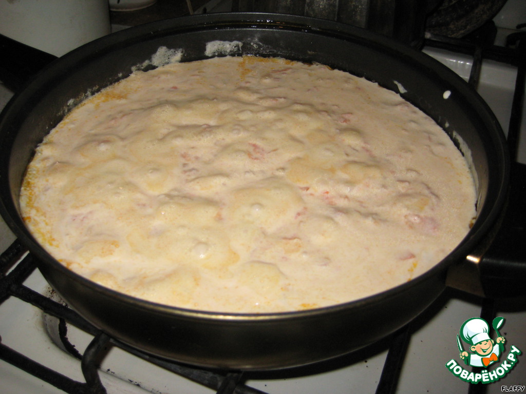 Добавить сметану, количество зависит от того, кому сколько соуса нужно. У меня на гарнир была гречка, поэтому сметаны брала 500 г, чтоб не было суховато. Добавляем соль, перец по вкусу. Я еще добаляла карри, поэтому соус желтоватый получился. Наши мужчины обычно добавляют стручок жгучего перца (потом достать). Тушить под крышкой опять минут 5-10.