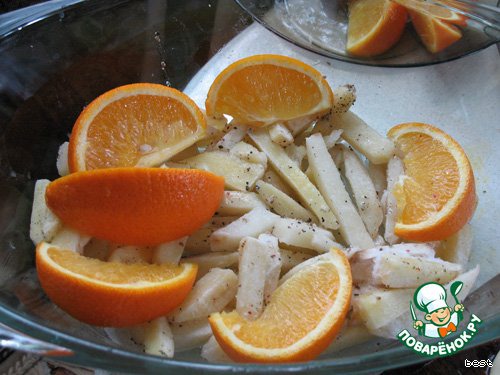 Форму смазать маслом, выложить картофель. Посолить, поперчить. Выложить сверху на картофель ломтики апельсина.