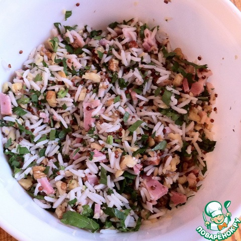 Крупу солим, перчим и добавляем рубленые грецкие орехи и нарезанную петрушку.