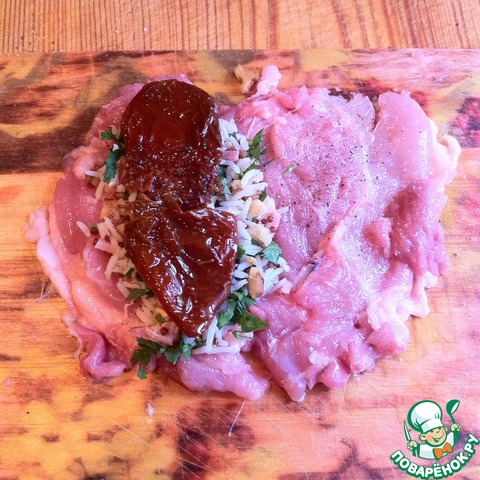 Для этого блюда я использовала филе бедра без кожи. Оно менее сухое, нежели грудка. Филе слегка отбиваем, солим и перчим. С одного края выкладываем рис с орехами. На него вяленые помидоры и формируем рулет. Так поступаем с каждым филе.