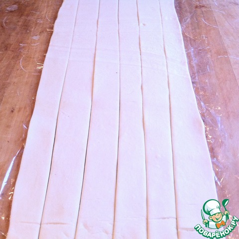 Тесто лучше использовать в рулоне. Разрезаем его вдоль на шесть одинаковых полос.